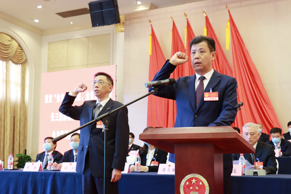 隨后,會場響起熱烈的掌聲。錢松、張亮走上主席臺向全體代表致謝,并向憲法莊嚴宣誓。