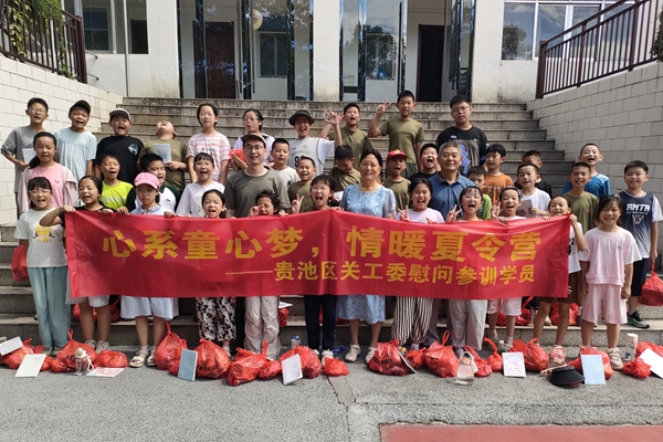 7月25日,區關工委一行帶著滿滿的關懷前往基地開展慰問活動。汪漪主任等人為貴池區及三所園區關工委共39名營員送上了精心準備的慰問品。他們還前往營地宿舍,實地察看孩子們的生活起居。看到孩子們小小年紀卻展現出堅強的意志和獨立的能力,大家紛紛豎起大拇指表示贊許。當聽到孩子們親切地喊著“謝謝爺爺、謝謝奶奶”時,他們心中滿是欣慰。此外,區關工委還為全市100名營員以及來自阜陽市太和縣的10名營員送去了學習用品,期待孩子們在夏令營中度過一段快樂難忘的時光。